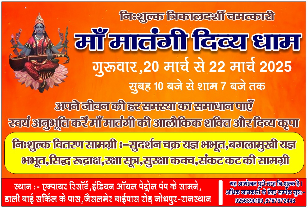 जोधपुर, राजस्थान: आध्यात्मिकता और चमत्कारिक शक्तियों में विश्वास रखने वाले भक्तों के लिए एक सुनहरा अवसर आ रहा है। त्रिकालदर्शी चमत्कारी मां मातंगी दिव्य दरबार का आयोजन 20 से 22 मार्च 2025 तक जोधपुर में होने जा रहा है। यह आयोजन पूरी तरह निःशुल्क होगा, जिसमें भक्त अपनी समस्याओं का समाधान पा सकेंगे और मां मातंगी की दिव्य कृपा का अनुभव कर सकेंगे।